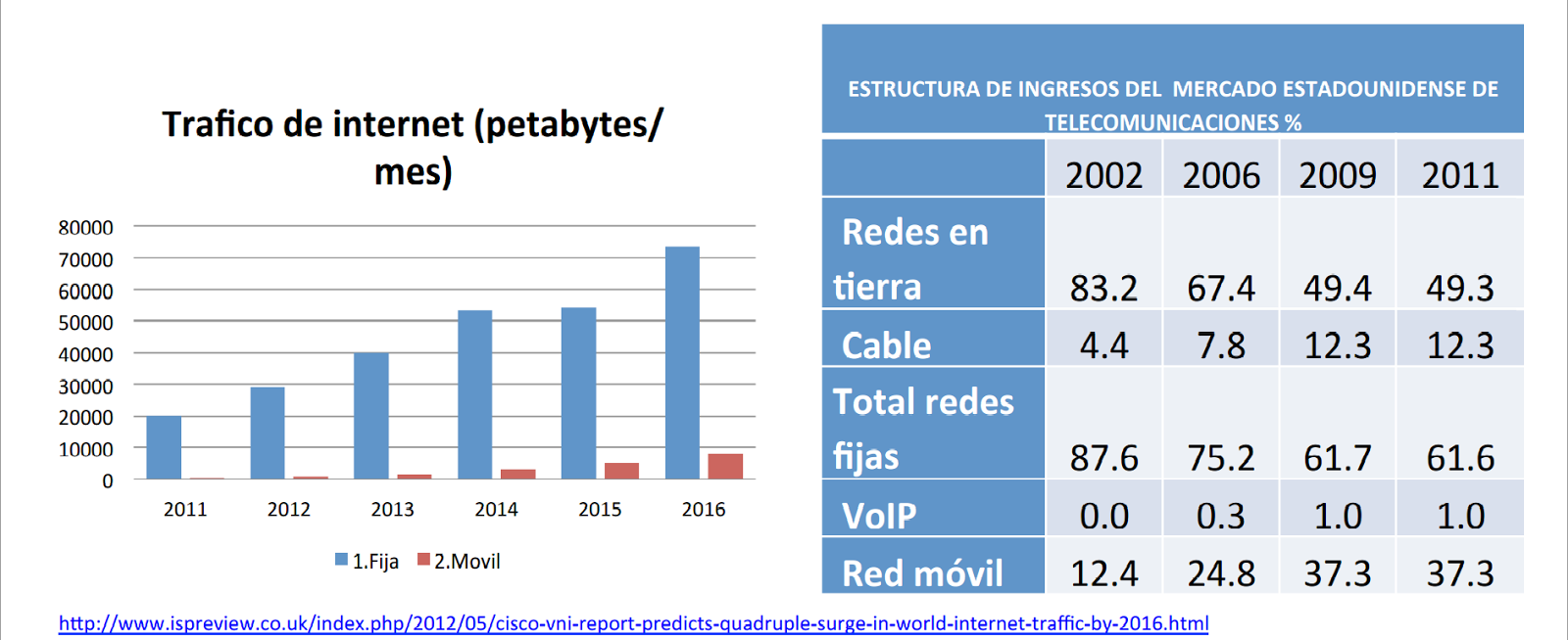 • El tráfico mensual de datos en 2013 fue de 40000 petabytes por medio de red fija mientras por comunicación móvil no llego ni a los 5000 petabytes. (http://www.ispreview.co.uk/